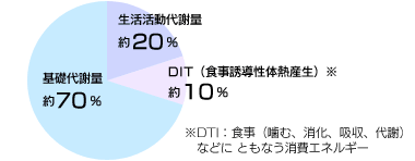 人間には、生きていくために最低限必要なエネルギーがあります。身体を横たえてじっとしたまま動かなくても、心臓を動かす、呼吸をする、体温を保つ など生命を保つために消費されるこのようなエネルギーのことで、基礎代謝といいます。一般的な活動量の人の場合、1日の活動で消費される総消費エネルギーの約70%が、なんとこの基礎代謝なのです。