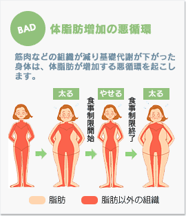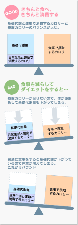 ダイエットには、基礎代謝が高い方が有利です。しかし、極端に食事を減らすと基礎代謝が下がってしまいます。体脂肪は身体を動かして積極的に燃焼させることが必要です。それをせずに、食事を減らすだけでは、身体は新しいエネルギーが入ってこないので、脂肪以外の筋肉などの組織を分解してエネルギーに替えようとする一方、消費エネルギーを節約しようとします。そのように基礎代謝量が減った身体は、食事量を元に戻すとまた太ってしまう、つまりリバウンドしやすい体質になります。ダイエット→リバウンド→ダイエット→リバウンド・・・を繰り返し、どんどん体脂肪が増加する悪循環になり身体にも負担をかけてしまいます。