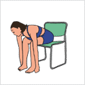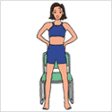 両手を腰にあて、軽く脚を開いて立ち、背後のイスにすわる直前で立ち上がる。