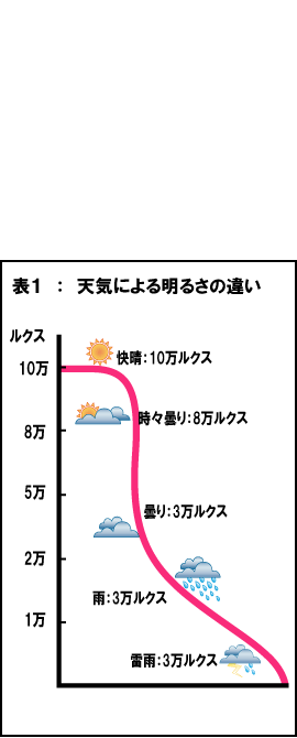 快晴の昼の明るさに対してうす雲が広がった日は半分に、 雨雲が立ちこめるような日には10分の1にまで照度が減ります。また晴れた日には紫外線などの目に見えない光も多いため、 強い光で眩しい割に見難いのですが、雨の日にはそういった妨害光線(?)も少ないので目に入る光が優しく、実は色が綺麗に見えたりします。