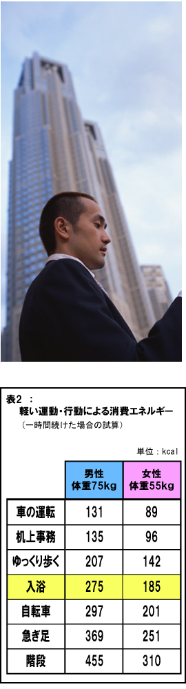 実はゆっくり歩きよりもお風呂の方がエネルギー消費が大きいのです。雨で家に居る時間が長いなら、是非この「お風呂タイム」をいつもよりゆっくりとって代 謝UPをはかりましょう。疲れが取れて新陳代謝もアップし、お肌の調子も良くなりますよ。食事の前に入ると空腹感を紛らわせてくれる効果もあるそうです。 ただ、かなり汗をかきますので長風呂しすぎると、脱水症状・めまい・立ちくらみなどの危険があります。ゆっくりお風呂を楽しむなら、必ずこまめに水分補給をし、時折湯船から出て休憩をとって様子をみるようにしてください。