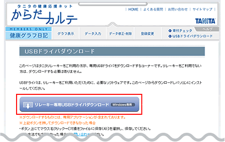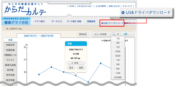 健康グラフ日記メニューの[USBドライバダウンロード]をクリック。