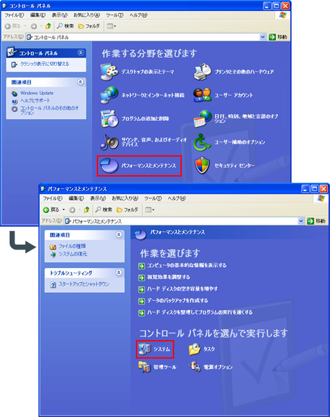 [パフォーマンスとメンテナンス]の分野を選択し、切りかわった画面下部の[システム]を選択します。システムのプロパティ画面が表示されます。