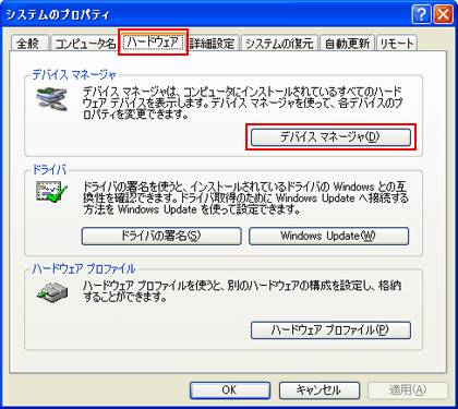 プロパティ画面内の[ハードウェア]タブ選択→[デバイスマネージャー]を選択します。