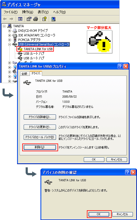 [TANITA LINK for USB] の箇所に黄色い注意マークが出ていますか?