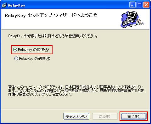 [リレーキーの修復(R)]をチェックし、[完了]を選択します。
